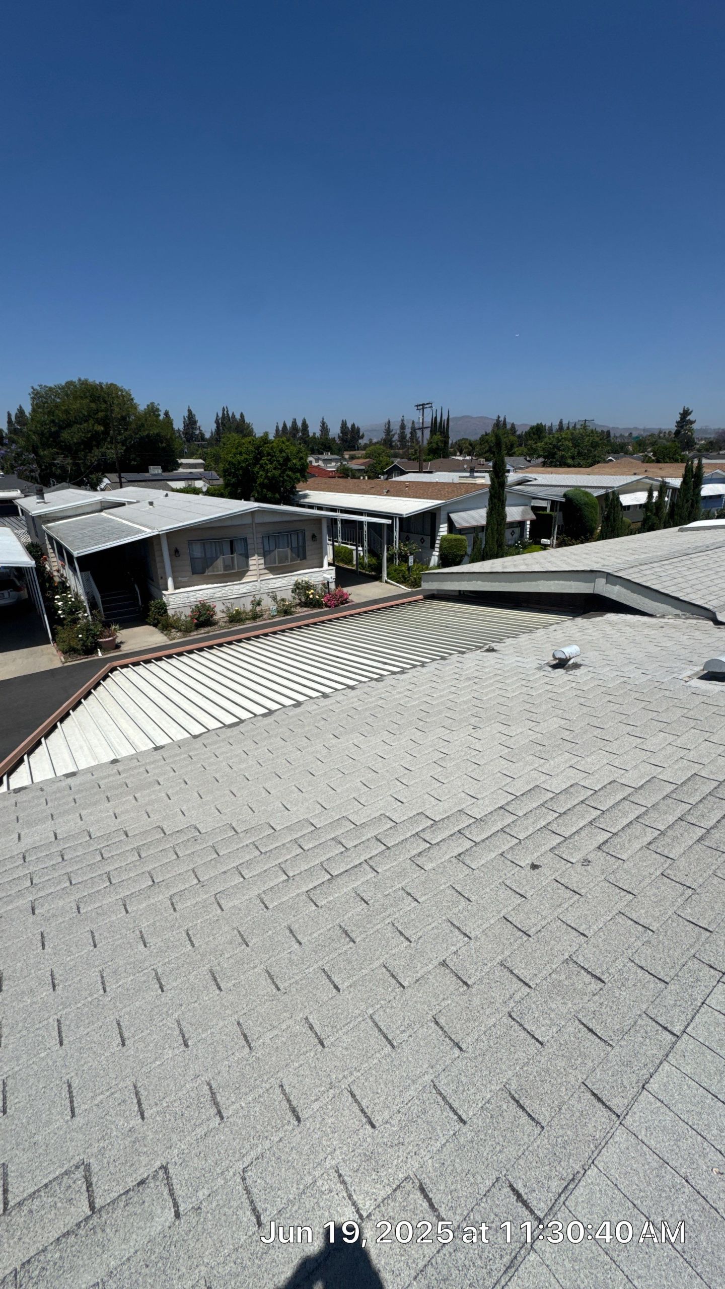 On June 19, 2025, Roof Repairs CA completed a detailed roof maintenance project at 15463 Copper St #8, Los Angeles, CA 91345. The roof, covered with light gray asphalt shingles, had several areas that required immediate attention to preserve its structural integrity—especially around metal transitions, penetrations, and a centrally located chimney vent.