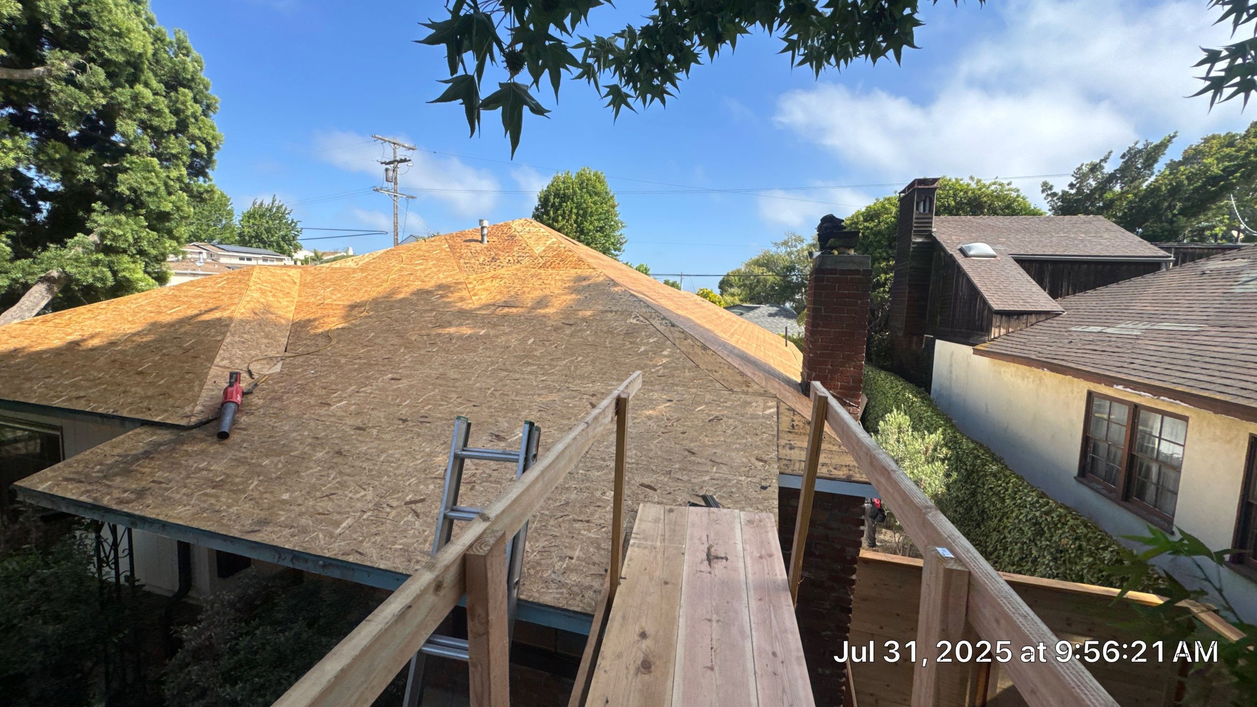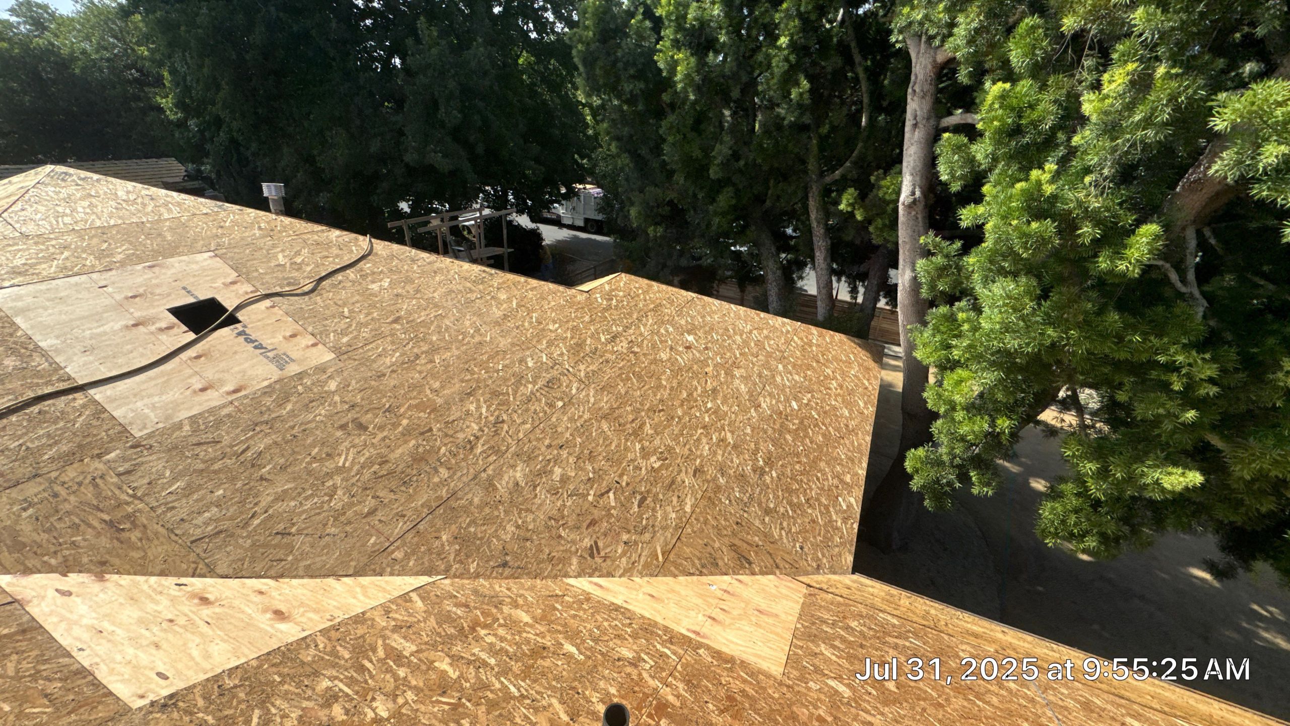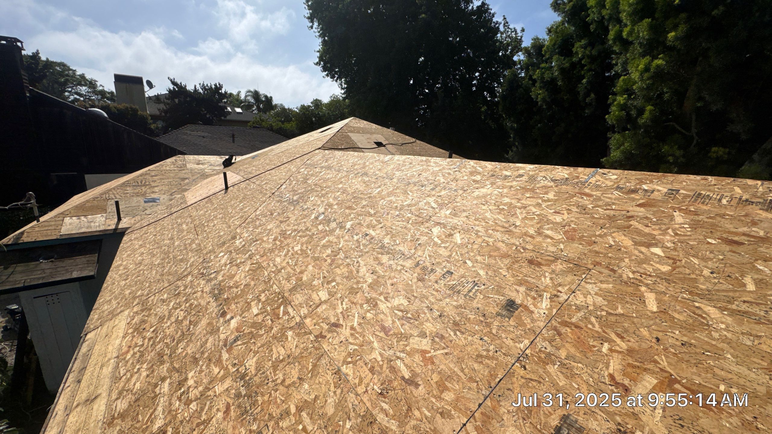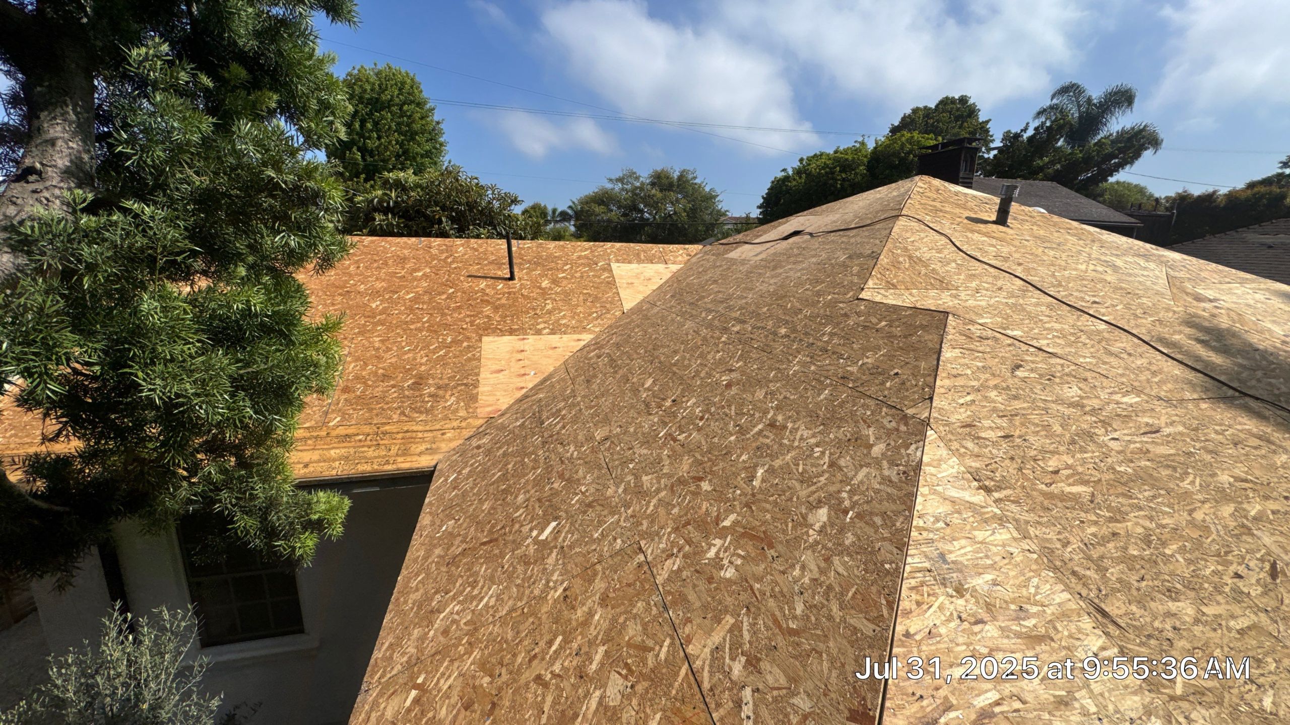 At 7393 W 81st St in Los Angeles, we performed a complete roofing overhaul starting July 31, 2025. The home’s original roof had reached the end of its lifespan, showing signs of wear, water damage, and instability in the decking. The scope of this project required a full tear-off down to the decking, where we replaced all sheathing with high-quality OSB plywood for structural integrity.