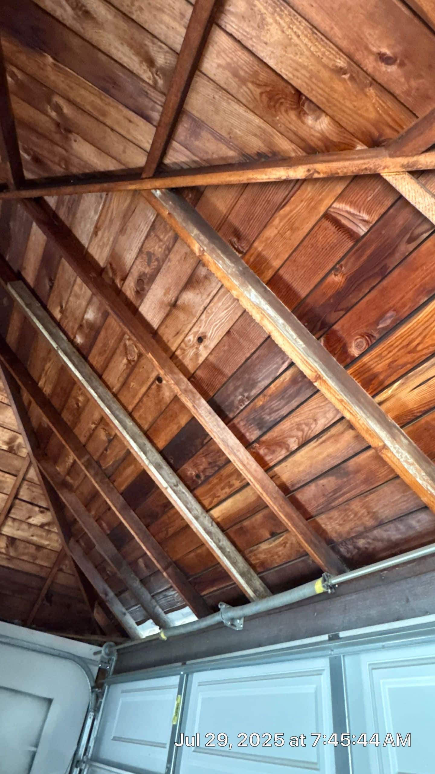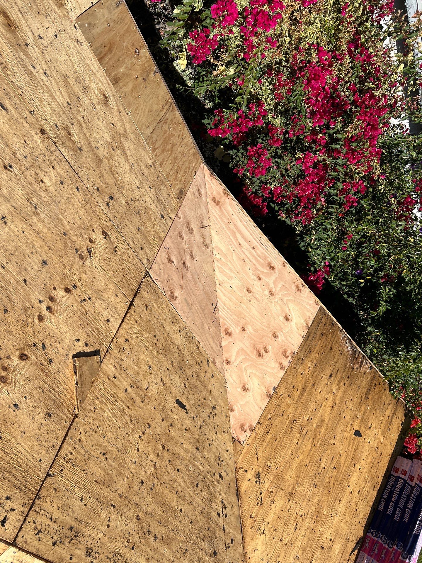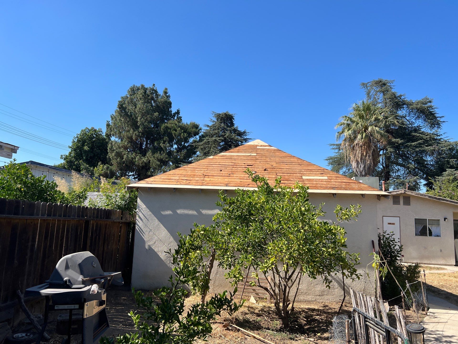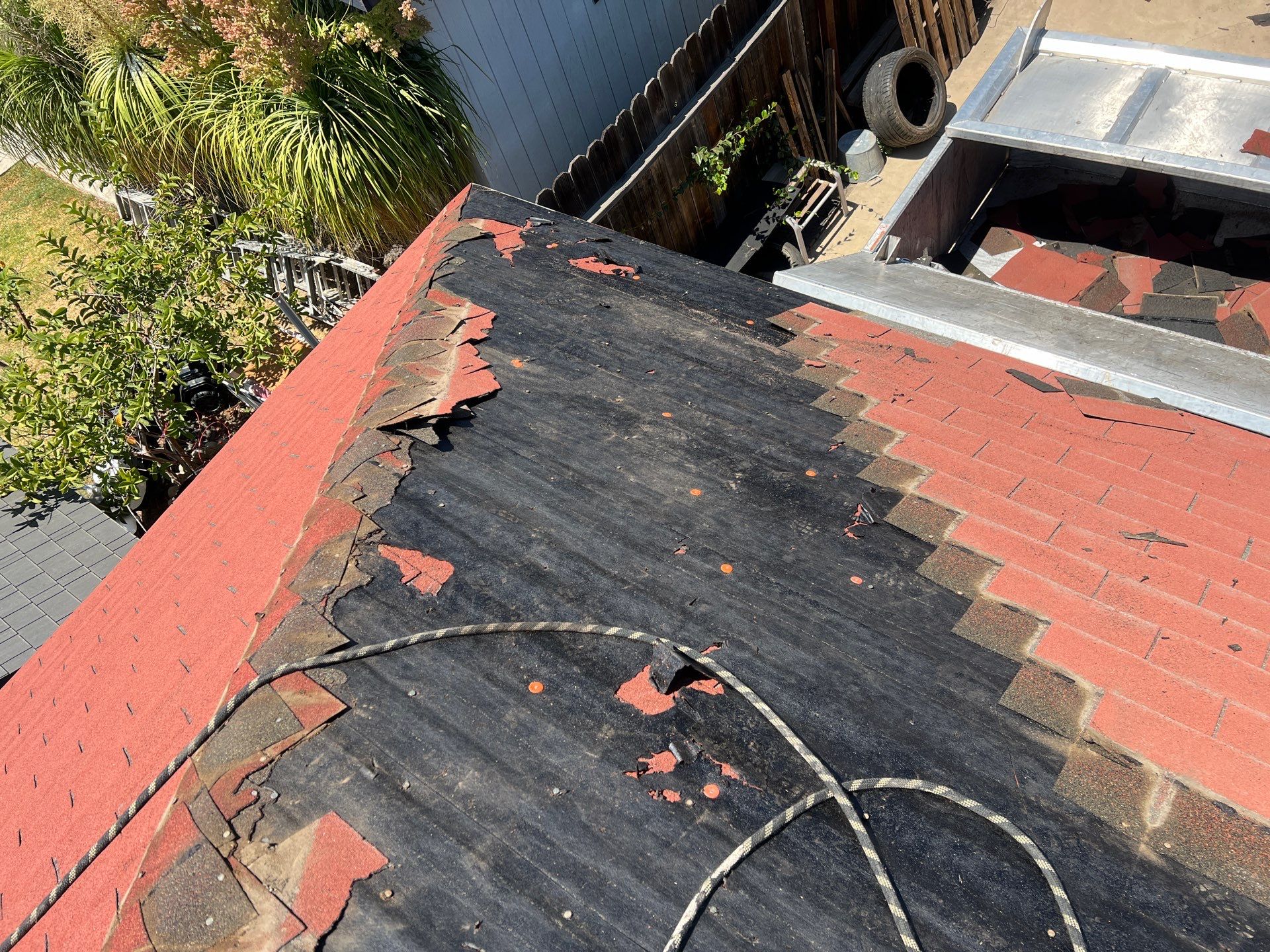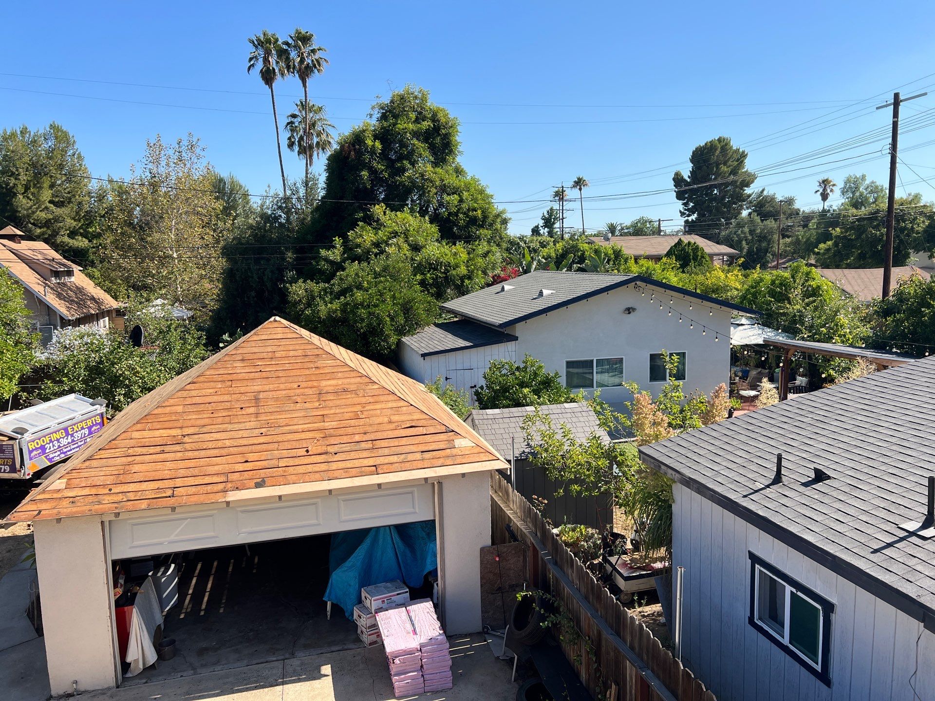 On July 29, 2025, Roof Repairs CA began a detailed roofing project at 15748 Romar St in Los Angeles. The property consisted of a main home and detached garage, both in need of a full roof replacement. The aging red shingles on the garage were brittle and peeling, and signs of water infiltration were evident on the interior sheathing boards of both structures.
