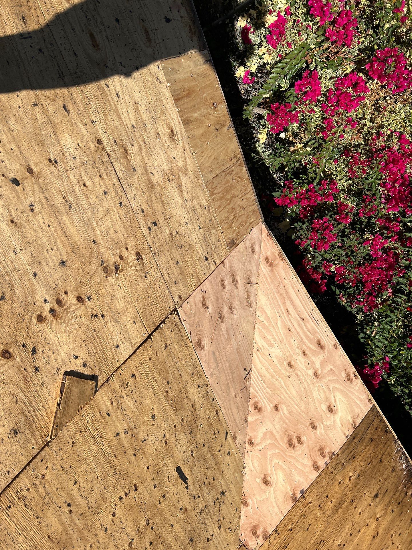 Our crew began with a full tear-off, removing all roofing layers down to the wood. Inspection revealed multiple problem areas—delaminated sheathing, rot, and even some exposed insulation where older framing had failed. These sections were removed and replaced with fresh plywood, and the new decking was laid down in uniform, staggered seams to maintain proper support.
