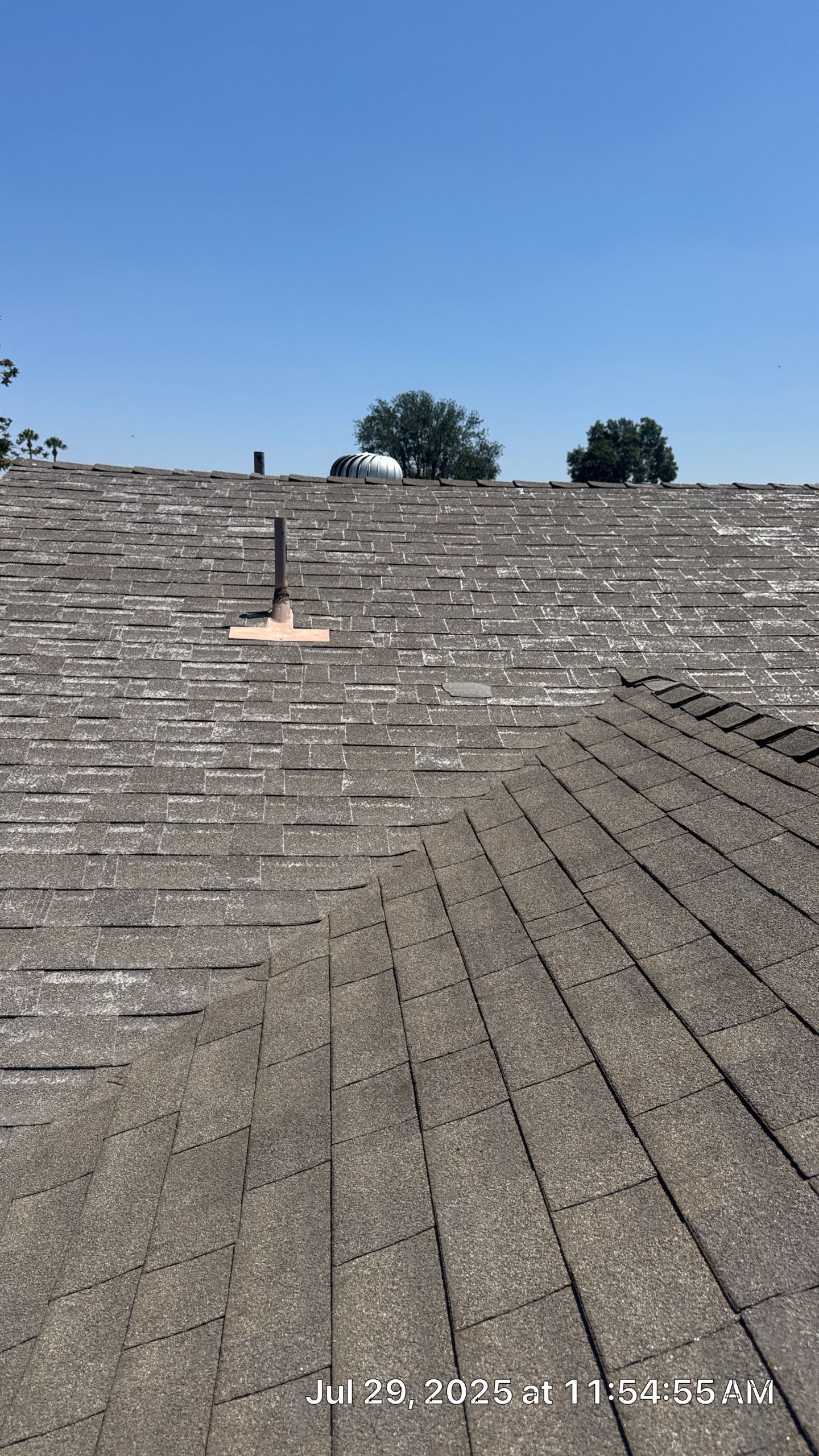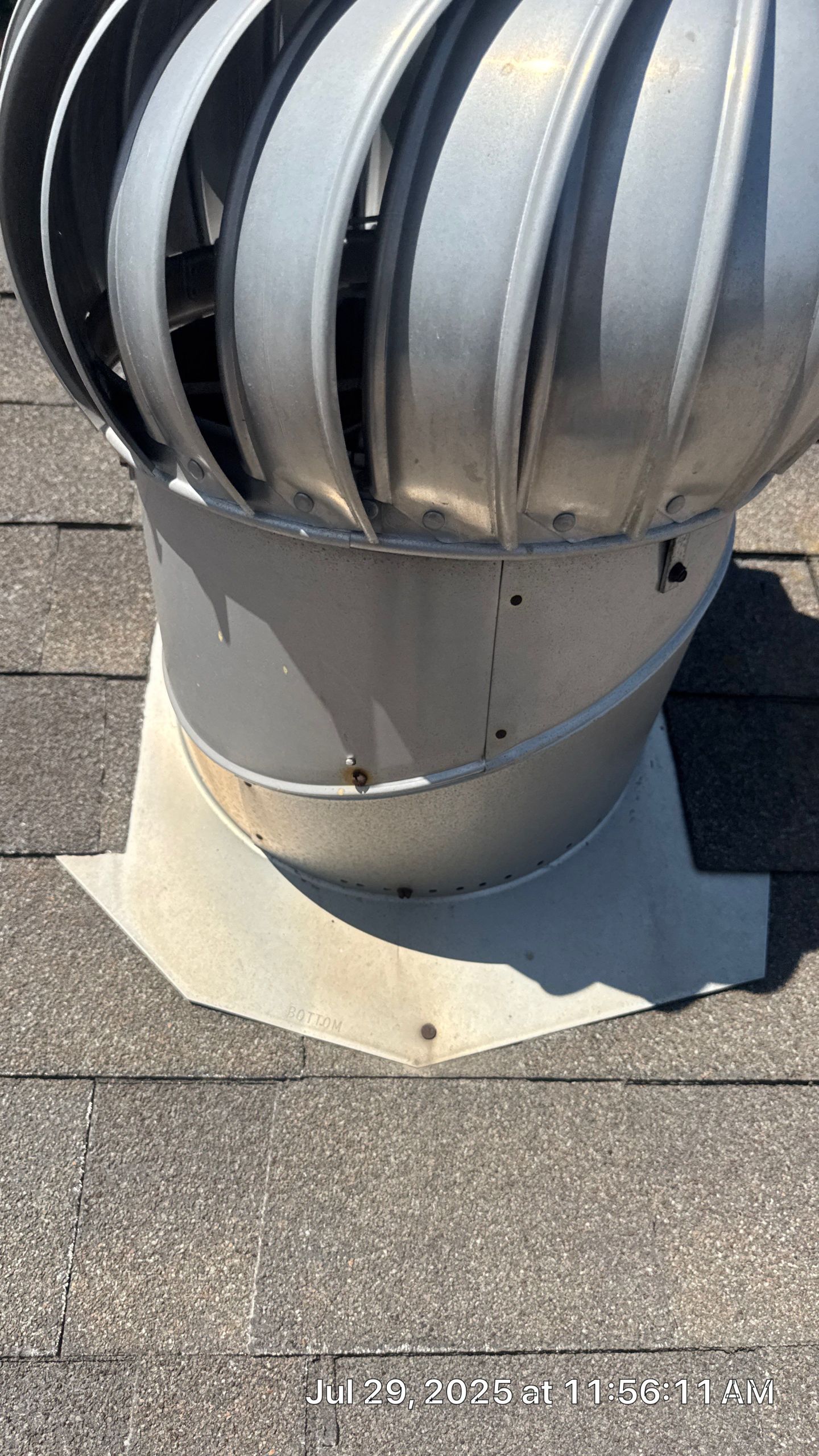 To enhance ventilation, we upgraded the system with two wind turbines and a continuous ridge vent spanning the roof’s peak. This dual-ventilation setup promotes airflow from low to high points, reducing attic heat and increasing roof longevity.